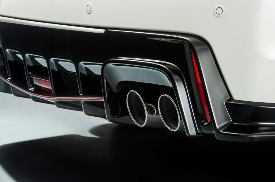 The car features a new front bumper, lip spoiler, black grille, new rear bumper, diffuser, large rear spoiler and side skirts. It stands on 19 inch wheels with 235/35 tires. The front brakes are from Brembo, with perforated disks of 350 mm and four-piston calipers.