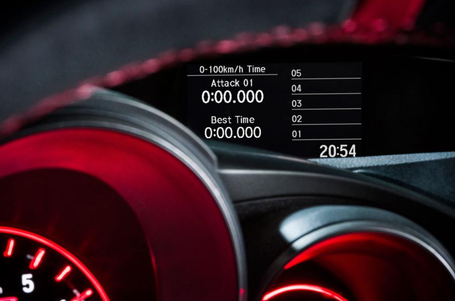 The interior features leather with red stitching and a new instrument panel with red lights. The interorior also has the Start/Stop button of the engine and the + R button, that changes various parameters, such as the response of the engine, the steering response and the Adaptive Damper System.