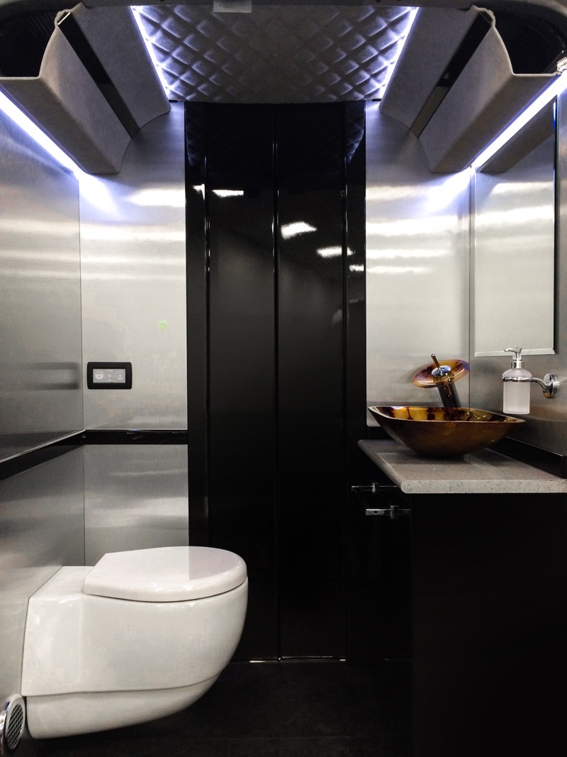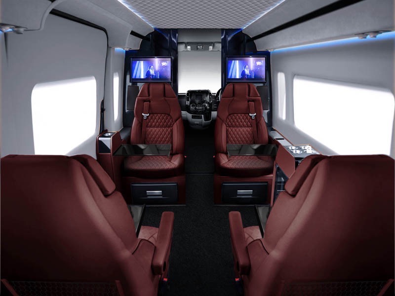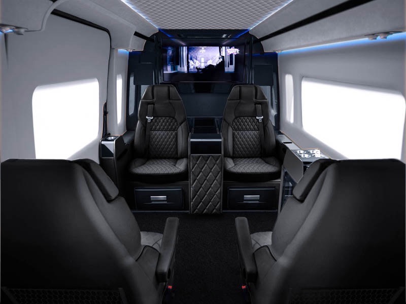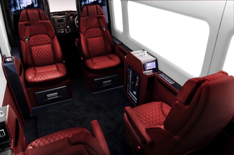 Senzati presented a luxurious interior that has been prepared for the Mercedes Sprinter. The interior of the car features leather seats, large TVs, huge glass roof, refrigerator with champagne and even a full bathroom. The conversion of the car’s interior costs £209,000.