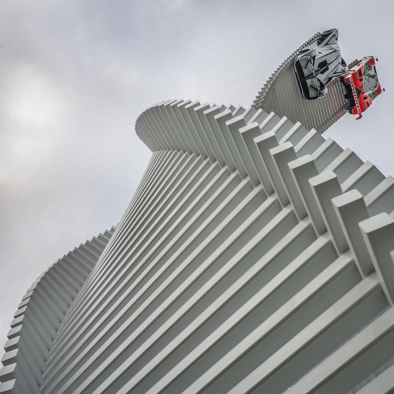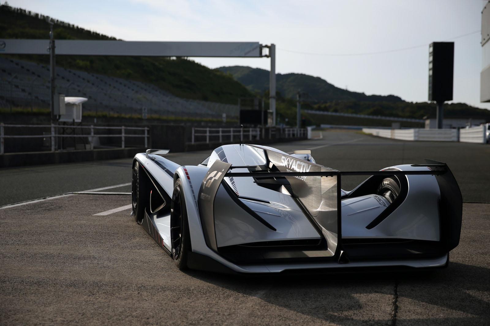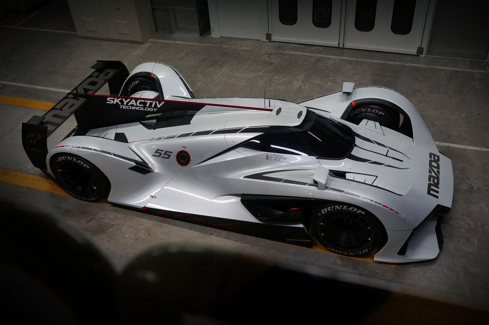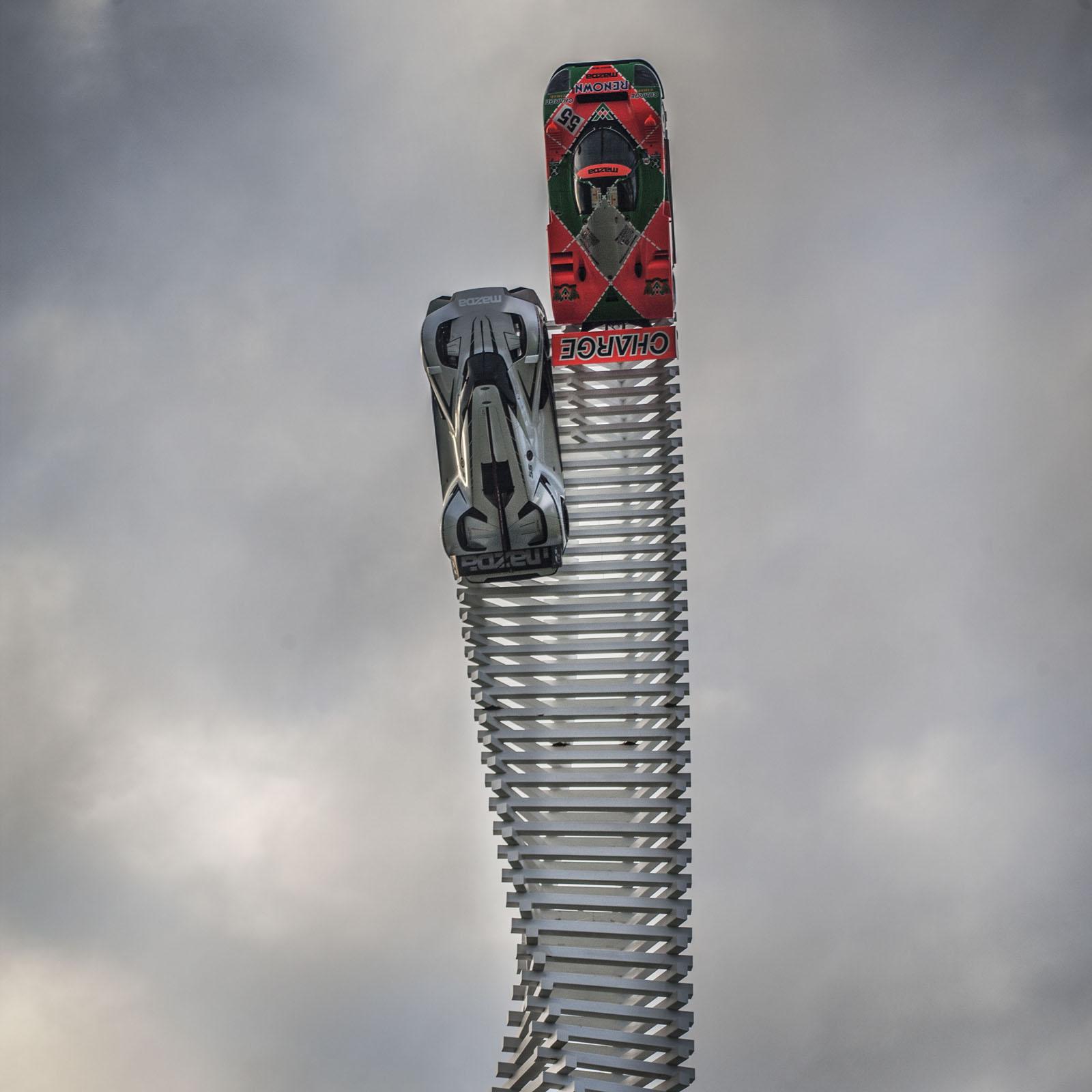The sculpture has on its top a Mazda 787B LMP1 racing car and a full-scale model of the Mazda LM55 Vision Gran Turismo.