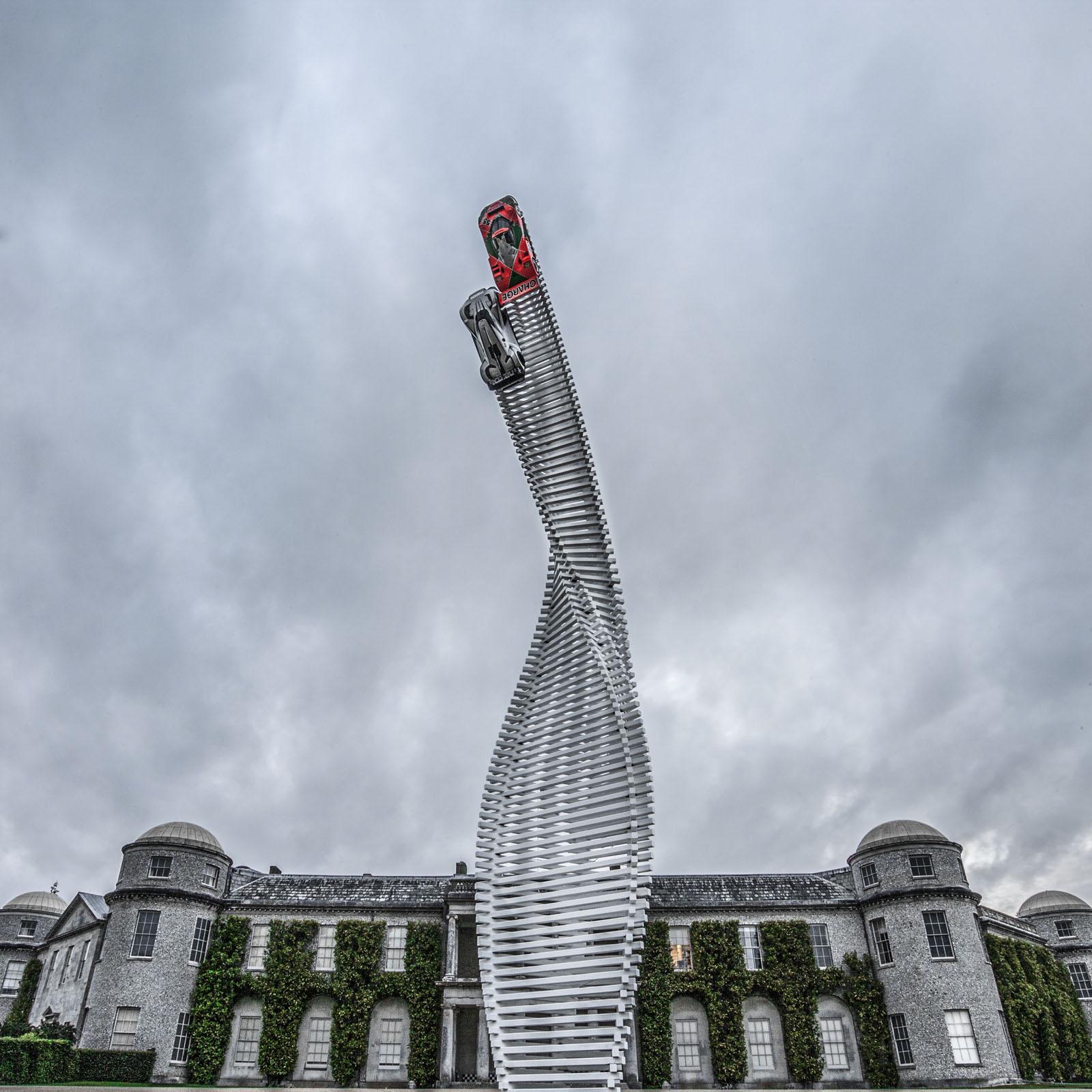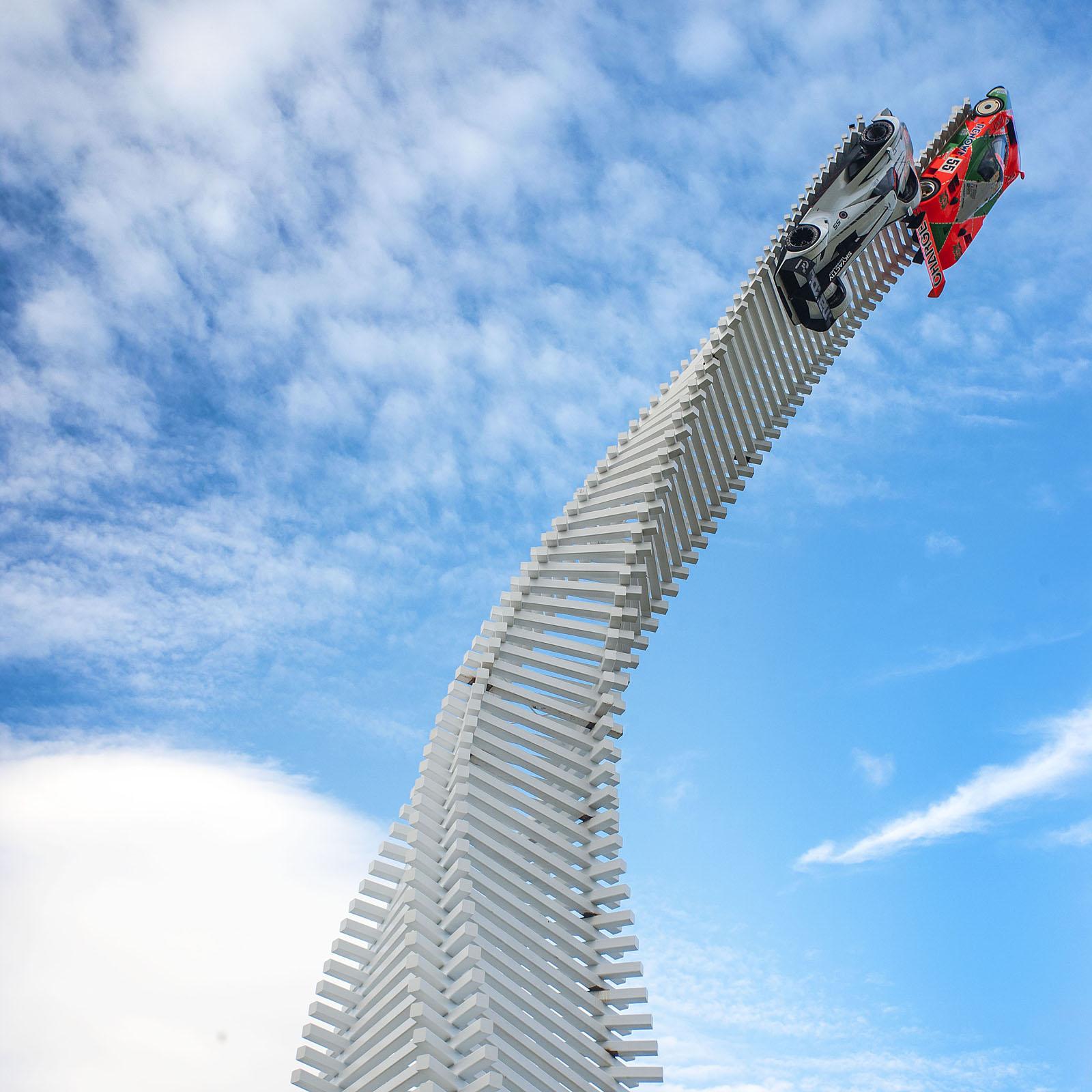 The Goodwood Festival of Speed started today and Mazda presented a sculpture for the event at the entrance of the estate. The sculpture has a height of 40 meters, it is composed of 418 iron beams, it weighs 120 tons and it pays tribute to the racing heritage of Mazda.
