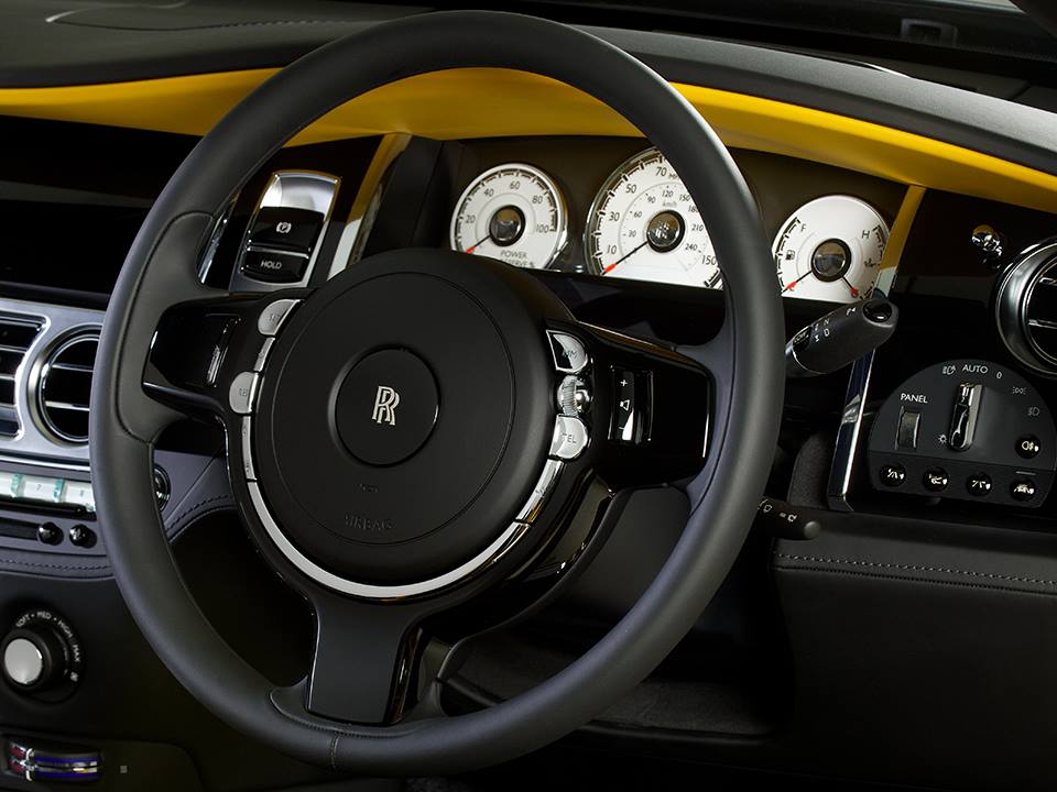 Rolls-Royce continues to release bespoke versions of their models, with their newwest custom model being a Wraith. The car is painted in a yellow gold color, with its top being painted in gray matte. Its interior features black and yellow leather upholstery, as well as wooden teak surfaces.