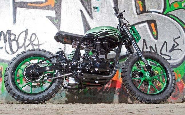 The Green Fly is based on the Classic 500, however its frame was borrowed from a Royal Enfield Continental GT and it was adapted to the needs of the bike. The bike has a single shock absorber on the back, a small seat, two small front lights and an inverted fork, which gives it an overall sporty look. Finally the bike has new green wheels and new off road tires.
